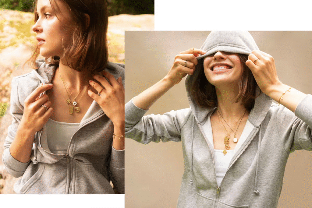 I’m a jewelry lover, but I don’t wear heavy jewelry with hoodies. I prefer simple pieces—like small hoops , dainty chains , and minimal rings .
